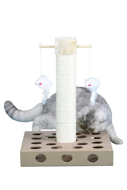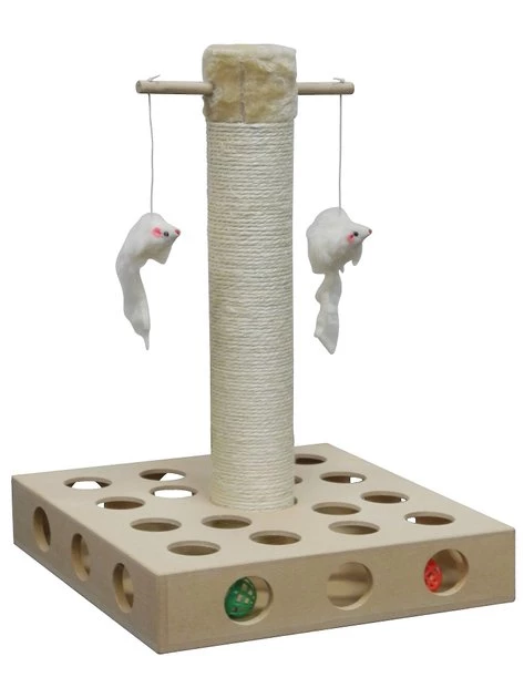 The Go Pet Club 20-in IQ Busy Box Cat Scratching Post & Toys offers mental stimulation for your feline friend young or old! The base of this tree features a wooden box with built-in holes and two removable balls, providing an interactive game that encourages your cat to try to catch them! A sisal rope-wrapped pole offers the purr-fect alternative for your kitty who likes to scratch your furniture and carpet. Two hanging mice are irresistible to your pal, enticing her to swat and bat away while you lovingly watch nearby.