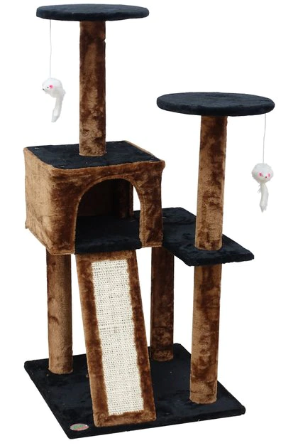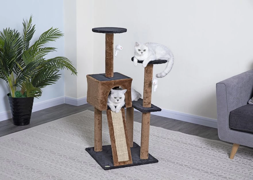 Your kitty will have a paw-some time cuddling up on the Go Pet Club 44-inch Kitten Cat Tree with Scratching Board. With individual perches at different height levels, she’ll always be able to find the purr-fect place to rest and relax. That is of course after she spends the day climbing and exploring her favorite cat tree. Not to mention all that extra energy she’ll use up scratching the large, natural sisal scratching board. The quiet condo playhouse will provide her with another place to curl up when she wants some additional peace and quiet. Built using durable compressed wood and finished with a comfy faux fur, she’ll enjoy this 44-inch cat tree for a long time to come.