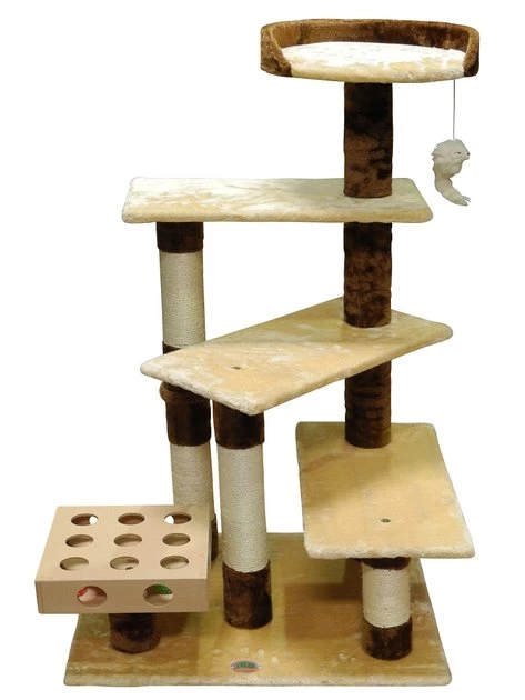 Your feline friend will look like the smartest kitty on the block with the Go Pet Club 45-in IQ Busy Box Cat Tree & Sisal Covered Scratching Posts. This multi-level tree features an IQ Busy Box that’s made with built-in holes and internal balls, stimulating your cat’s mind with active play and engagement. A dangly mouse awakens your pal’s natural hunting instinct and sisal rope-wrapped posts encourage healthy scratching behavior. Three elevated platforms provide the purr-fect surfaces for perching while the top bed offers a cozy escape from the world below. The tree is outfitted in a luxurious faux-fur finish for ideal comfort and warmth!