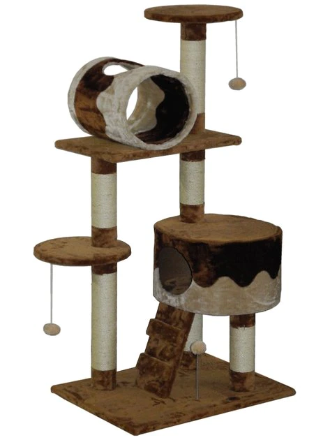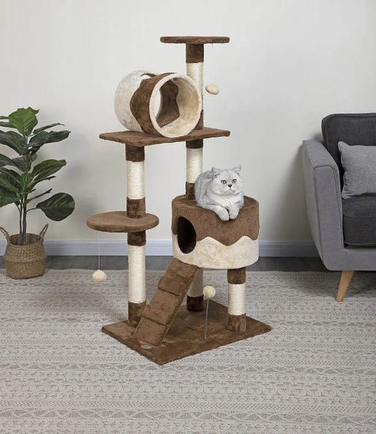 There’s no special occasion needed to gift your feline friend her very own Go Pet Club 51.5-in Cat Tree Condo with Dangling Balls. This oasis includes everything your cat needs to feel right at home! Your kitty can use the ramp to climb up to the condo, a cozy retreat that provides the privacy she needs to take a peaceful snooze. The multiple elevated surfaces are the purr-fect platforms for perching, encouraging your girl to observe her surroundings with pride. An upper tunnel is incredibly cozy and offers a great angle for swatting and batting one of the three dangly balls. To keep your cat’s nails looking their best, she can scratch away at the sisal rope-wrapped posts.