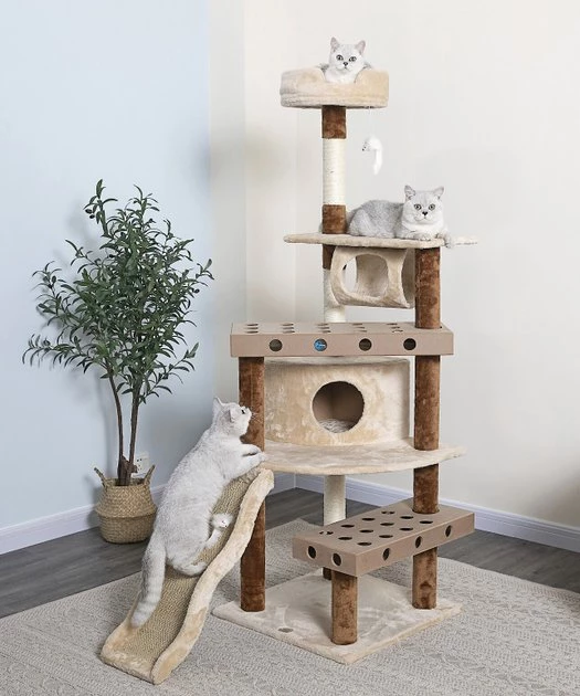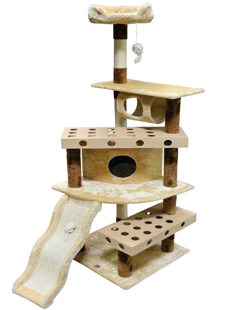 The Go Pet Club 70-in IQ Busy Box Cat Tree Condo & Sisal Scratching Board provides your pal with mental stimulation so he can always be on his game. This tree features not just one, but two IQ Busy Boxes, an engaging activity that’s made with cut-out holes and removable balls for swatting and batting fun. Dangly toy mice are purr-fect for tapping into your cat’s natural hunting skills while the sisal rope posts and ramp are designed for safe scratching. A lofted platform, tunnel and top-level bed give your feline friend the elevation he needs to perch and observe his kingdom. The cozy faux-fur design includes a private condo, a quiet escape for your cat for whenever he wants a getaway from household noise and distractions.