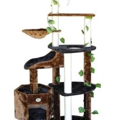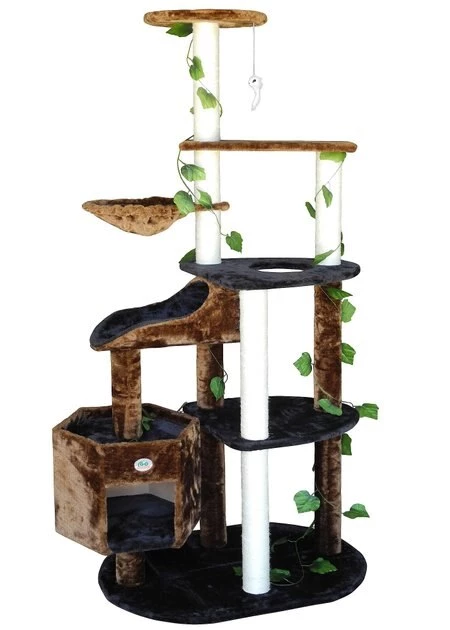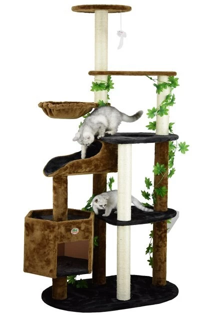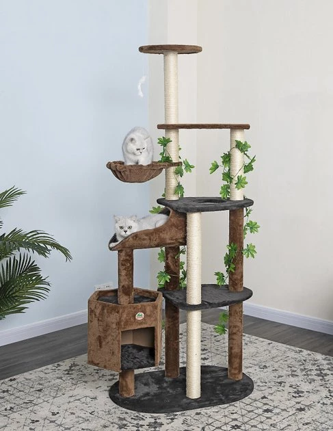 Your indoor feline friend will love the outdoor-inspired Go Pet Club 74-in Forest with Leaves Cat Tree. This faux-fur tree is adorned in artificial vines and leaves, providing your pal with a taste of the wild even if she never leaves the house! Elevated platforms are purr-fect for perching while a cozy sunken basket is ideal for cuddling into. The oasis features a private condo retreat, offering your best bud an escape from distractions and the family dog! Instead of scratching at your furniture and floors, your cat can use the sisal rope-wrapped posts to keep her claws trimmed. The hanging toy mouse encourages her to bat and swat away for interactive fun that never gets old!