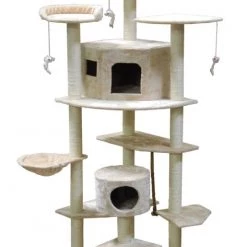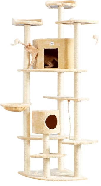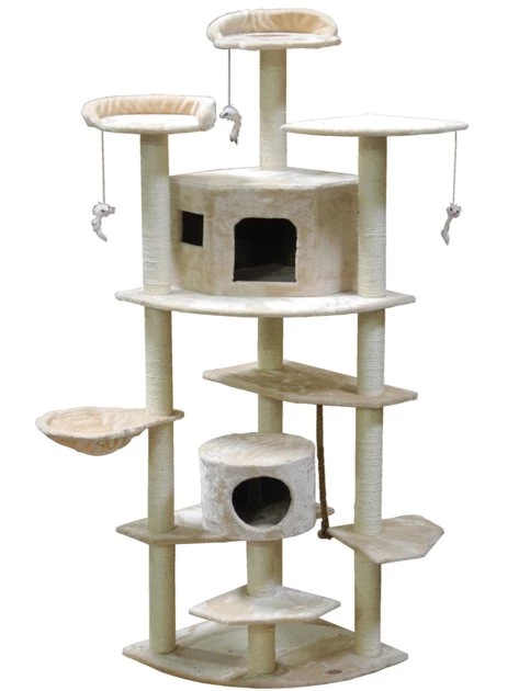 Go Pet Club 80-inch Cat Tree gives your furry friend a place to call her own. This tree features three hanging toys and a hanging rope to play with. It also has many posts covered in natural sisal rope to fulfill those natural instincts by scratching and climbing on them. Your paw-tner can relax on multiple levels of this tree or get some privacy in the covered area. Easy-to-setup and available in colors to match any décor, this tree from Go Pet Club is the perfect addition to any home with one or multiple cats.