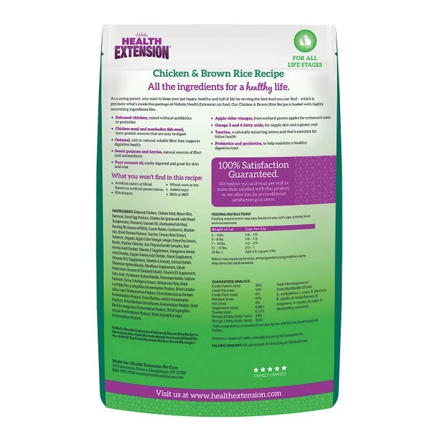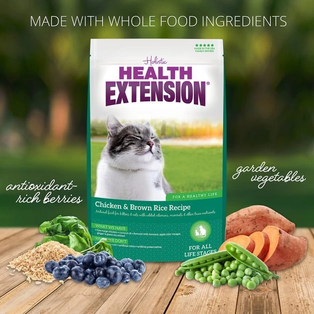 You will fill your feline friend’s bowl with a yummy, balanced meal when you serve Health Extension Chicken & Brown Rice Recipe Dry Cat Food. This recipe is made with real, naturally-raised chicken as the very first ingredient, along with brown rice, antioxidant-rich berries, turmeric and more. Plus, herring oil adds extra dose of omega-3, DHA and taurine. With a convenient bite-sized kibble shape, this food is great for kittens and older cats alike. And, since it’s free of artificial flavors and preservatives, it’s an all-around paw-sitively great choice for your cat.