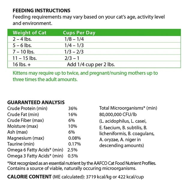 Feeding requirements may vary based on your cat’s age, activity level and environment. Kittens may require up to twice, and pregnant/nursing mothers up to three times the adult amounts.