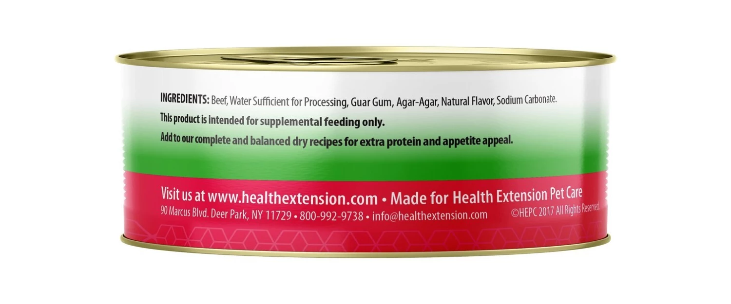 Feeding requirements may vary based on your dog’s age, activity level and environment. Health Extension Meaty Mix for Puppies & Dogs is made exclusively with Beef. Canines love beef, so add this supplement to their dry food daily.