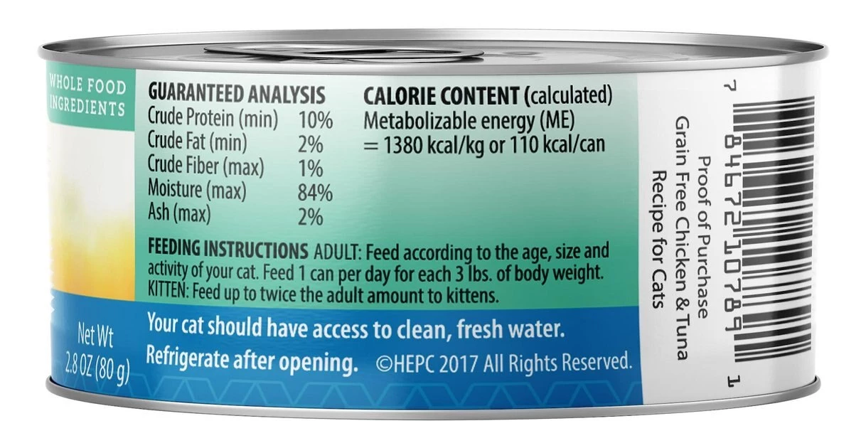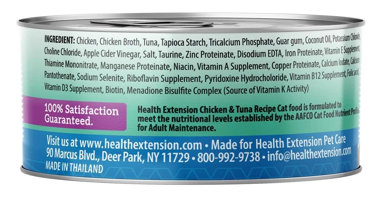 The Health Extension Grain-Free Chicken & Tuna Recipe Canned Cat Food nourishes your feline with every single bite. Made to provide years of soft purrs and gentle nuzzles, this holistic recipe is specially formulated to promote a shiny coat, resilient immune system, flexible joints, and strong bones. It’s chock full of vitamins and nutrients that also maintain a healthy urinary tract, and your cat will love the chicken and tuna flavors with rich fruits and vegetables—and you’ll feel great about giving him paw-some food.