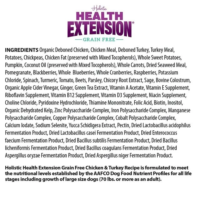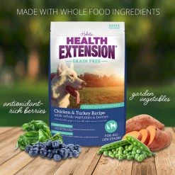 You will fill your dog’s bowl with a yummy, balanced meal when you serve Health Extension Grain Free Chicken & Turkey Dry Dog Food. This dry dog food is chock-full of delicious and nutritious goodness. Organically-raised chicken is the very first ingredient, along with hearty chickpeas, whole garden veggies, antioxidant-packed berries and more. It’s ultra-palatable and highly digestible to be super gentle on your dog’s stomach. This carefully-crafted recipe is designed to support a shiny skin and coat, strong bones and joints, as well as digestive and immune system health––supporting your pal from nose to tail!