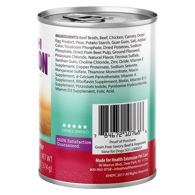 Health Extension provides a variety of premium, holistic choices for pet parents, including their delicious Grain-Free Savory Beef Stew Canned Dog Food. This savory stew is made with shreds of all-natural beef raised without growth hormones or steroids for an excellent source of high-quality protein. There are no allergy-related fillers like grains, glutens or wheat to make sure your pup is getting the quality nutrition he needs. Health Extension Savory Beef Stew can be added to dry dog food for a hearty meal with added protein.