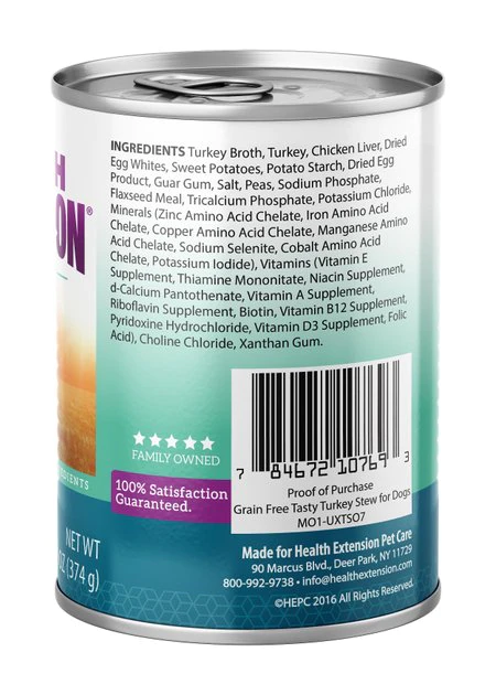 Health Extension provides a variety of premium, holistic choices for pet parents, including their delicious Grain-Free Tasty Turkey Stew Canned Dog Food. This savory stew is made with shreds of all-natural turkey raised without growth hormones or steroids for an excellent source of high-quality protein. There are no allergy-related fillers like grains, glutens or wheat to make sure your pup is getting the quality nutrition he needs. Health Extension Tasty Turkey Stew can be added to dry dog food for a hearty meal with added protein.