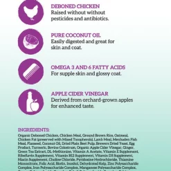 Organic Deboned Chicken, Chicken Meal, Ground Brown Rice, Oatmeal, Chicken Fat (preserved with Mixed Tocopherols), Lamb Meal, Menhaden Fish Meal, Flaxseed, Coconut Oil, Dried Plain Beet Pulp, Brewers Dried Yeast, Egg Product, Turmeric, Bovine Colostrum, Organic Apple Cider Vinegar, Ginger, Green Tea Extract, DL-Methionine, Vitamin A Acetate, Vitamin E Supplement, Riboflavin Supplement, Vitamin B12 Supplement, Vitamin D3 Supplement, Niacin Supplement, Choline Chloride, Pyridoxine Hydrochloride, Thiamine Mononitrate, Folic Acid, Biotin, Inositol, Dehydrated Kelp, Zinc Polysaccharide Complex, Iron Polysaccharide Complex, Manganese Polysaccharide Complex, Copper Polysaccharide Complex, Cobalt Polysaccharide Complex, Calcium lodate, Sodium Selenite, Yucca Schidigera Extract, Dried Lactobacillus acidophilus Fermentation Product, Dried Lactobacillus Casei Fermentation Product, Dried Enterococcus Faecium Fermentation Product, Dried Bacillus Subtilis Fermentation Product, Dried Bacillus licheniformis Fermentation Product, Dried Bacillus coagulans Fermentation Product, Dried Aspergillus Oryzae Fermentation Product, Dried Aspergillus Niger Fermentation Product.