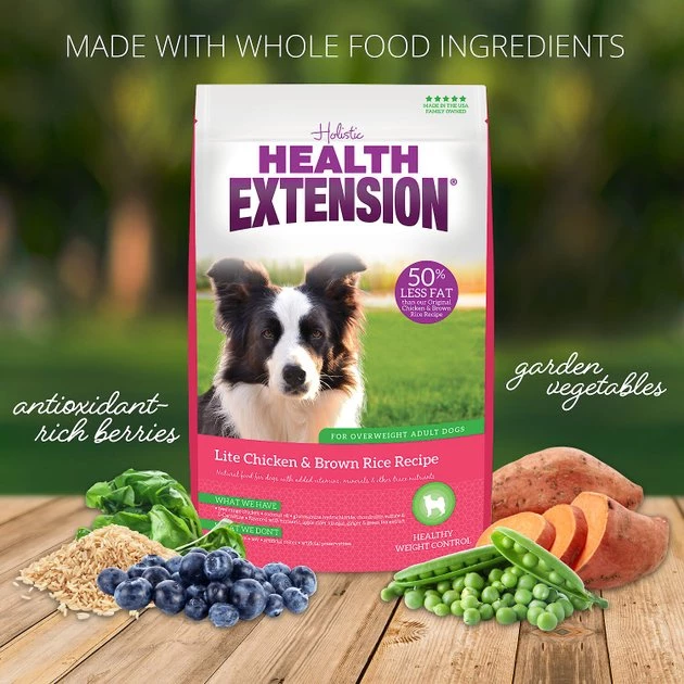 Make mealtime holistically nutritious with the Health Extension Lite Dry Dog Food. Specially formulated to meet the needs of overweight, spayed, neutered or senior dogs, it’s made with organic, free-range chicken as the first ingredient, plus whole foods like brown rice, oatmeal, and lamb. Designed to provide a balanced diet as well as promote overall health, it also has superfoods like flaxseeds, milk thistle, cranberry extract, primrose oil, kelp, green tea, and blue-green algae. Plus, it has probiotics for tummy health, CoQ10 to support heart health, and a balanced blend of omega-3 and 6 fatty acids. The hypoallergenic, anti-hypoglycemic formula is made with no added sugar and never any gluten, corn, wheat, soy, by-products, artificial preservatives or colors.