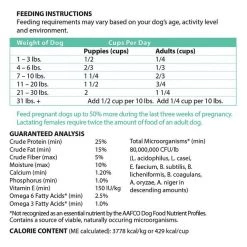 Deboned Salmon, Menhaden Fish Meal (source of Omega-3 fatty acids), Chickpeas, Lentils, Deboned Whiteÿsh, Salmon Oil (preserved with mixed tocopherols), Tapioca Starch, Whiteÿsh Meal, Whole Sweet Potatoes, Pumpkin, Peas, Coconut Oil (preserved with mixed tocopherols), Whole Carrots, Dried Seaweed Meal, Pomegranate, Blackberries, Whole Blueberries, Whole Cranberries, Raspberries, Potassium Chloride, Spinach, Turmeric, Tomato, Beets, Parsley, Chicory Root Extract, Sage, Bovine Colostrum, Organic Apple Cider Vinegar, Ginger, Green Tea Extract, Vitamin A Acetate, Vitamin E Supplement, Ribo˝avin Supplement, Vitamin B-12 Supplement, Vitamin D-3 Supplement, Niacin Supplement, Choline Chloride, Pyridoxine Hydro-chloride, Thiamine Mononitrate, Folic Acid, Biotin, Inositol, Organic Dehydrated Kelp, Zinc Polysaccharide Complex, Iron Polysaccharide Complex, Manganese Polysaccharide Complex, Copper Polysaccharide Complex, Cobalt Polysaccharide Complex, Calcium Iodate, Sodium Selenite, Yucca Schidigera Extract, Pectin, Dried Lactobacillus acidophi-lus Fermentation Product, Dried Lactobacillus casei Fermentation Product, Dried Enterococcus faecium Fermentation Product, Dried Bacillus subtilis Fermentation Product, Dried Bacillus licheniformis Fermentation Product, Dried Baciollus coagulans Fermentation Product, Dried Aspergillus oryzae Fermentation Product, Dried Aspergillus niger Fermentation Product.