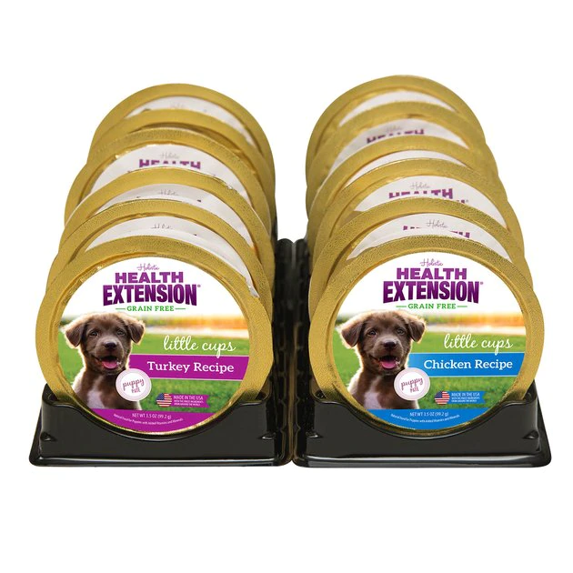 Feed your growing puppy the wholesome goodness of Health Extension Little Cups Chicken & Turkey Recipe Variety Pack Grain-Free Wet Puppy Food. This pack comes with 12, 3.5-oz cans of two delectable recipes—Chicken Recipe Puppy Pate and Turkey Recipe Puppy Pate. Both flavors start with real chicken or turkey first and contain other recognizable ingredients like real fruits and veggies. Both recipes provide complete and balanced nutrition for puppies and are 100% free from gluten, rendered animal fats and by-products. They are also completely free from added sugar, carrageenan, corn, wheat and soy. Your puppy will love the smooth, meaty texture in every bite!