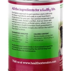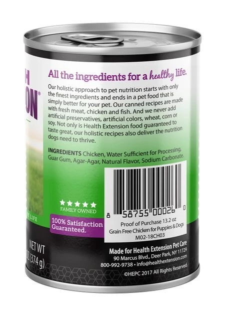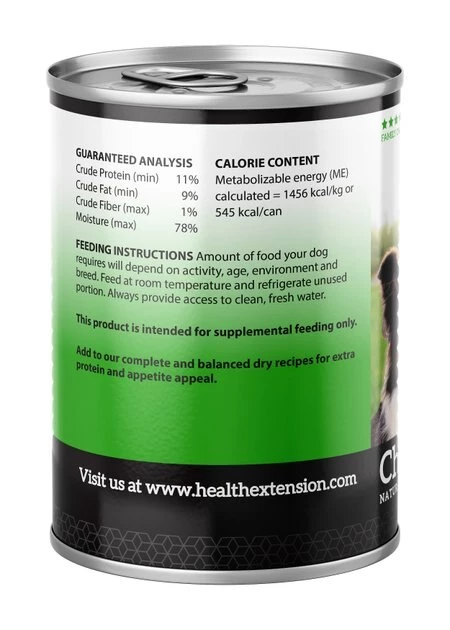 Feeding requirements may vary based on your dog’s age, activity level and environment. Can be fed as a complete balanced diet for your puppy or dog. It can also be used with the Health Extension dry food to enhance the flavor and nutrition. Amount of food your dog requires will depend on activity, age, environment and breed.