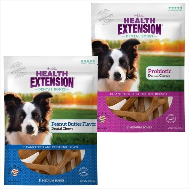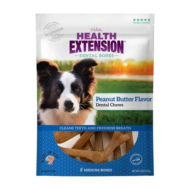 - Health Extension Peanut Butter Flavored Medium Dental Dog Treats, 8 count—Packed with antioxidants, vitamins, minerals and essential amino acids for his whole-body health.