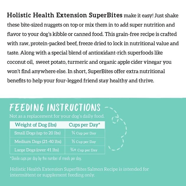 - Salmon Super Bites mixer boosts the nutrition and flavor of your dog’s food.