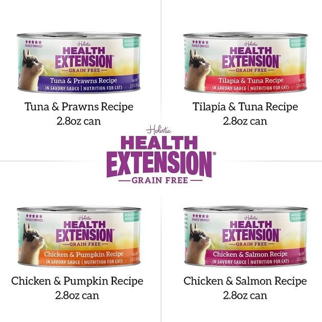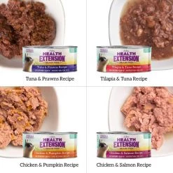 The Health Extension Variety Pack Grain-Free Canned Cat Food includes all of your kitty’s fur-avorite flavors for paw-somely exciting meals. Health Extension food includes real tilapia, tuna, chicken, salmon, prawns and chicken for natural, tasty goodness. In addition to wholesome proteins, added coconut oil and apple cider vinegar support your cat’s health. This food also provides essential moisture to help keep your furbaby hydrated and promote urinary tract health. While this food is packed full of pure, good ingredients, it’s free of stuff like by-products, grains, soy, glutens, added sugars and artificial colors or flavors. With four delicious flavors to choose from, mealtime just got a whole lot more exciting for your feline friend!