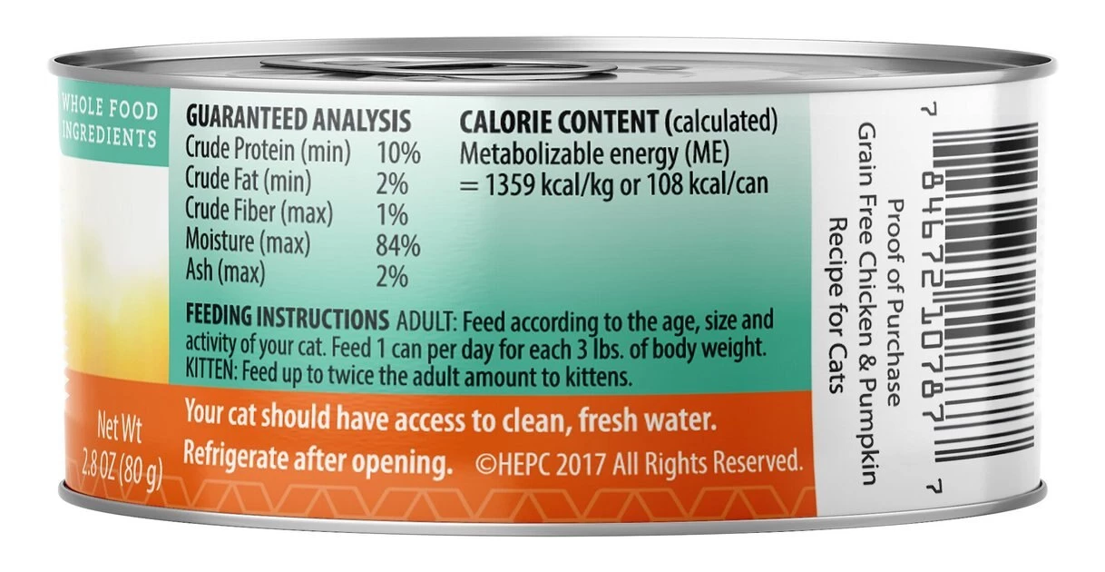 Chicken & Pumpkin= Chicken, Chicken Broth, Pumpkin, Tapioca Starch, Pea Protein, Tricalcium Phosphate, GuarGum, Coconut Oil, Apple Cider Vinegar, Choline Chloride, Potassium Chloride, Magnesium Sulfate, Taurine, ZincProteinate, Disodium EDTA, Iron Proteinate, Vitamin E Supplement, Thiamine Mononitrate, Manganese Proteinate, Niacin, Vitamin A Supplement, Copper Proteinate, Calcium Iodate, Calcium Pantothenate, Sodium Selenite, Riboflavin Supplement, Pyridoxine Hydrochloride, Vitamin B12 Supplement, Folic Acid, Vitamin D3 Supplement, Biotin, Menadione Sodium Bisulfite Complex (Source of Vitamin K Activity)