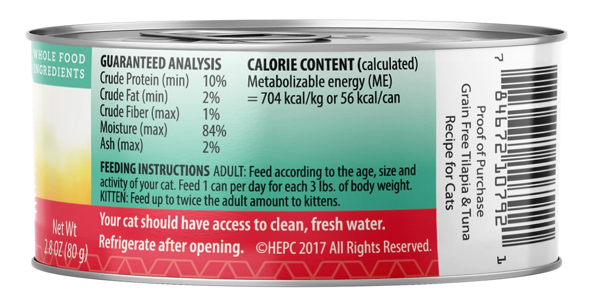 Tilapia & Tuna=Tilapia Broth, Tilapia, Tuna, Sunflower Oil, Tapioca Starch, Tricalcium Phosphate, Guar Gum, Coconut Oil, Apple Cider Vinegar, Choline Chloride, Potassium Chloride, Magnesium Sulfate, Taurine, Zinc Proteinate, Iron Proteinate, Vitamin E Supplement, Thiamine Mononitrate, Manganese Proteinate, Niacin, Vitamin A Supplement, Copper Proteinate, Calcium Iodate, Calcium Pantothenate, Sodium Selenite, Riboflavin Supplement, Pyridoxine Hydrochloride, Vitamin B12 Supplement, Folic Acid, Biotin, Menadione Sodium Bisulfite Complex (Source of Vitamin K Activity)