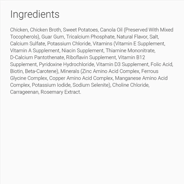 Chicken, Chicken Broth, Sweet Potatoes, Canola Oil (Preserved with Mixed Tocopherols), Guar Gum, Tricalcium Phosphate, Natural Flavor, Salt, Calcium Sulfate, Potassium Chloride, Vitamins (Vitamin E Supplement, Vitamin A Supplement, Niacin Supplement, Thiamine Mononitrate, D-Calcium Pantothenate, Riboflavin Supplement, Vitamin B12 Supplement, Pyridoxine Hydrochloride, Vitamin D3 Supplement, Folic Acid, Biotin, Beta-Carotene), Minerals (Zinc Amino Acid Complex, Ferrous Glycine Complex, Copper Amino Acid Complex, Manganese Amino Acid Complex, Potassium Iodide, Sodium Selenite), Choline Chloride, Carrageenan, Rosemary Extract.