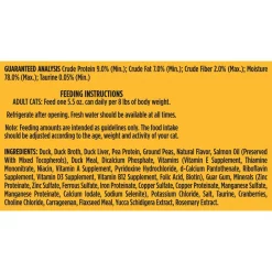 Duck, Duck Broth, Duck Liver, Pea Protein, Ground Peas, Natural Flavor, Salmon Oil (Preserved with Mixed Tocopherols), Duck Meal, Dicalcium Phosphate, Vitamins (Vitamin E Supplement, Thiamine Mononitrate, Niacin, Vitamin A Supplement, Pyridoxine Hydrochloride, D-Calcium Pantothenate, Riboflavin Supplement, Vitamin D3 Supplement, Vitamin B12 Supplement, Folic Acid, Biotin), Guar Gum, Minerals (Zinc Proteinate, Zinc Sulfate, Ferrous Sulfate, Iron Proteinate, Copper Sulfate, Copper Proteinate, Manganese Sulfate, Manganese Proteinate, Calcium Iodate, Sodium Selenite), Potassium Chloride, Salt, Taurine, Cranberries, Choline Chloride, Carrageenan, Flaxseed Meal, Yucca Schidigera Extract, Rosemary Extract.