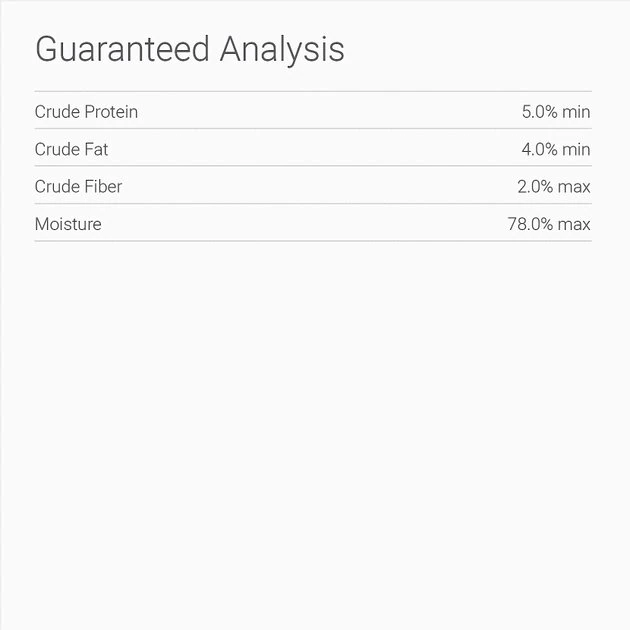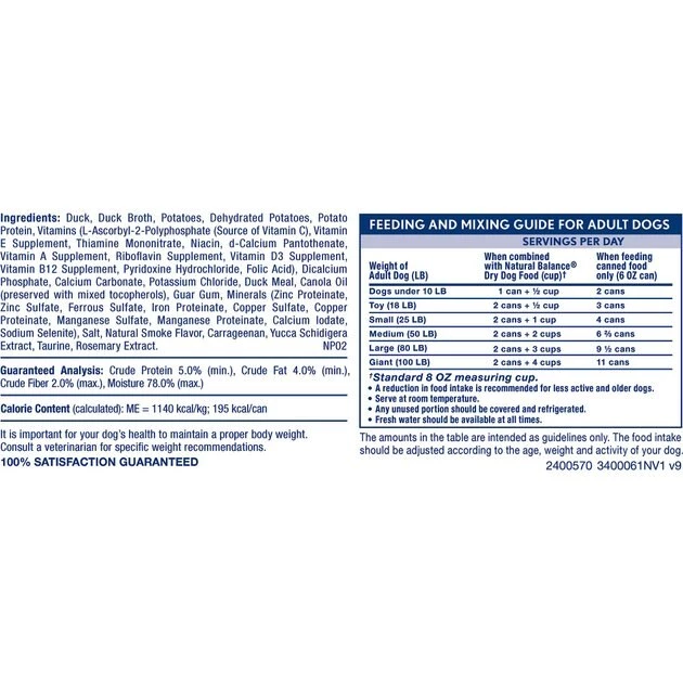 Duck, Duck Broth, Potatoes, Dehydrated Potatoes, Potato Protein, Vitamins (L-Ascorbyl-2-Polyphosphate (Source of Vitamin C), Vitamin E Supplement, Thiamine Mononitrate, Niacin, D-Calcium Pantothenate, Vitamin A Supplement, Riboflavin Supplement, Vitamin D3 Supplement, Vitamin B12 Supplement, Pyridoxine Hydrochloride, Folic Acid), Dicalcium Phosphate, Calcium Carbonate, Potassium Chloride, Duck Meal, Canola Oil (Preserved with Mixed Tocopherols), Guar Gum, Minerals (Zinc Proteinate, Zinc Sulfate, Ferrous Sulfate, Iron Proteinate, Copper Sulfate, Copper Proteinate, Manganese Sulfate, Manganese Proteinate, Calcium Iodate, Sodium Selenite), Salt, Natural Smoke Flavor, Carrageenan, Yucca Schidigera Extract, Taurine, Rosemary Extract.