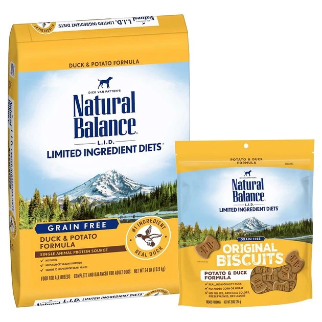 Your dog will love this Natural Balance L.I.D. Limited Ingredient Diets Grain-Free Duck & Potato Formula Dry Food + L.I.T. Limited Ingredient Grain-Free Treats Potato & Duck Formula Dog Treats combo pack! The limited-ingredient dry food features farm-raised duck as the very first ingredient and potatoes as an easily digestible source of carbohydrates. It is formulated by a team of board-certified clinical veterinarians, animal nutritionists, research scientists, design engineers and pet feeding analysts with over 125 years of combined experience. This premium dry dog food is crafted to provide the nutrition, quality and taste that your doggie dude deserves. It is produced in the USA using the world’s finest ingredients and does not contain any added peas, pea protein, lentils, legumes, corn, wheat or soy. The L.I.T. Limited Ingredient Grain-Free Treats are crafted with a limited number of protein and carbohydrate sources. They are scientifically formulated to provide high-quality nutrition and optimize skin and coat. If there’s one thing Buster likes more than a snack it’s a snack made of duck! The limited ingredients are made for dogs that suffer from food allergies, and rosemary extract reduces sensitivity to environmental allergies, too. Plus, these crunchy, bite-sized treats will clean his teeth as he chews.