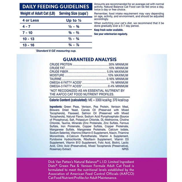 When switching your cat’s diet, the change should be made gradually, by replacing the current food with increasing portions of Natural Balance® L.I.D. Limited Ingredient Diets® Green Pea & Venison Dry Cat Food. The change should be completed after 5 – 7 days.