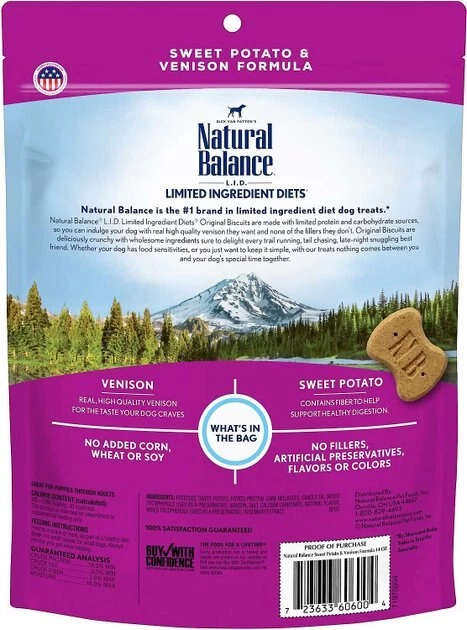 - This duo includes Natural Balance L.I.D. Limited Ingredient Diets Sweet Potato & Venison Formula Grain-Free Canned Dog Food and Natural Balance L.I.T. Limited Ingredient Grain-Free Treats Sweet Potato & Venison Formula Dog Treats.