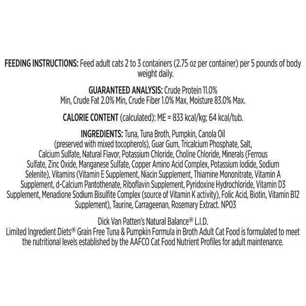 Give your sensitive kitty the nutrition he craves with the Natural Balance L.I.D. Limited Ingredient Diets Tuna & Pumpkin Formula Flaked Grain-Free Wet Cat Food. Made especially for kitties with sensitivities, this recipe contains just a few carefully-chosen ingredients that will keep him thriving, including a single animal protein source—flaked tuna—as the top ingredient to support all those furry adventures. Every juicy bite is loaded with fiber-rich pumpkin, vitamins, minerals, essential taurine, and omegas to support nose-to-tail well-being and a lustrous coat—not to mention the irresistible flavor that’ll have him running to his bowl every time. And since it’s made with real broth, it helps keep your kitty hydrated to support urinary health. Plus, it has zero grains or anything artificial. Because sensitive or not, he’s a carnivore at heart.