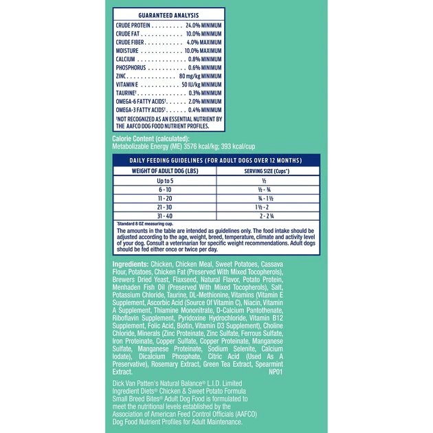 Adult dogs should be fed either once or twice per day. When you first start feeding Natural Balance L.I.D. Limited Ingredient Diets Chicken & Sweet Potato Formula Small Breed Bites Adult Dog Food, we suggest starting with the amounts recommended in the table. Energy requirements vary with environmental conditions, temperature and activity of your dog. The amount of food should always be adjusted to suit your dog’s needs.