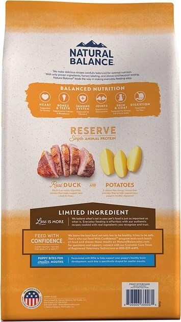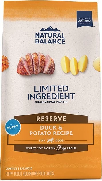 Give your growing puppy the nutrients he needs to become big and strong with the wholesome ingredients in Natural Balance Limited Ingredient Reserve Grain-Free Duck & Potato Puppy Recipe Dry Dog Food! Featuring protein-packed duck meat, fiber-rich potato, and nutritious fish oil, this grain-free puppy chow helps support your little pup’s muscles, digestion, and brain development. With no grains, soy, gluten, artificial colors, or artificial flavors, this hearty puppy food is the paw-fect meal for puppies of all breeds—including those with sensitive stomachs, skin irritations, and allergies. Simply serve at mealtimes and watch as your little fur baby goes quackers for the delightful crunch!