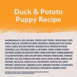 Duck, Duck Meal, Potatoes, Sweet Potatoes, Tapioca Starch, Potato Protein, Canola Oil (Preserved With Mixed Tocopherols), Brewers Dried Yeast, Natural Flavor, Flaxseed, Dicalcium Phosphate, Menhaden Fish Oil (Preserved With Mixed Tocopherols), Salt, Potassium Chloride, Dl-Methionine, Taurine, Vitamins (Vitamin E Supplement, Ascorbic Acid, Niacin Supplement, Vitamin A Supplement, Thiamine Mononitrate, D-Calcium Pantothenate, Riboflavin Supplement, Pyridoxine Hydrochloride, Vitamin B12 Supplement, Folic Acid, Vitamin D3 Supplement, Biotin), Choline Chloride, Minerals (Zinc Proteinate, Zinc Sulfate, Ferrous Sulfate, Iron Proteinate, Copper Sulfate, Copper Proteinate, Sodium Selenite, Manganese Sulfate, Manganese Proteinate, Calcium Iodate), Citric Acid (Preservative), Mixed Tocopherols (Preservative), Rosemary Extract.