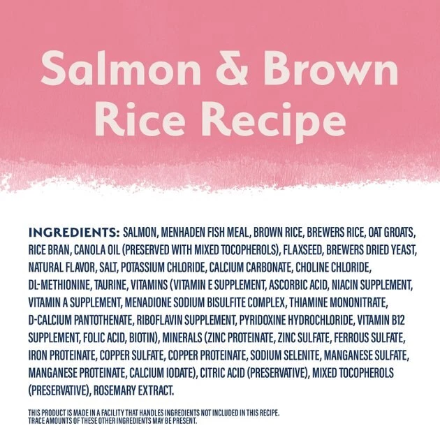 Salmon, Menhaden Fish Meal, Brown Rice, Brewers Rice, Oat Groats, Rice Bran, Canola Oil (Preserved With Mixed Tocopherols), Flaxseed, Brewers Dried Yeast, Natural Flavor, Salt, Potassium Chloride, Calcium Carbonate, Choline Chloride, Dl-Methionine, Taurine, Vitamins (Vitamin E Supplement, Ascorbic Acid, Niacin Supplement, Vitamin A Supplement, Menadione Sodium Bisulfite Complex, Thiamine Mononitrate, D-Calcium Pantothenate, Riboflavin Supplement, Pyridoxine Hydrochloride, Vitamin B12 Supplement, Folic Acid, Biotin), Minerals (Zinc Proteinate, Zinc Sulfate, Ferrous Sulfate, Iron Proteinate, Copper Sulfate, Copper Proteinate, Sodium Selenite, Manganese Sulfate, Manganese Proteinate, Calcium Iodate), Citric Acid (Preservative), Mixed Tocopherols (Preservative), Rosemary Extract.
