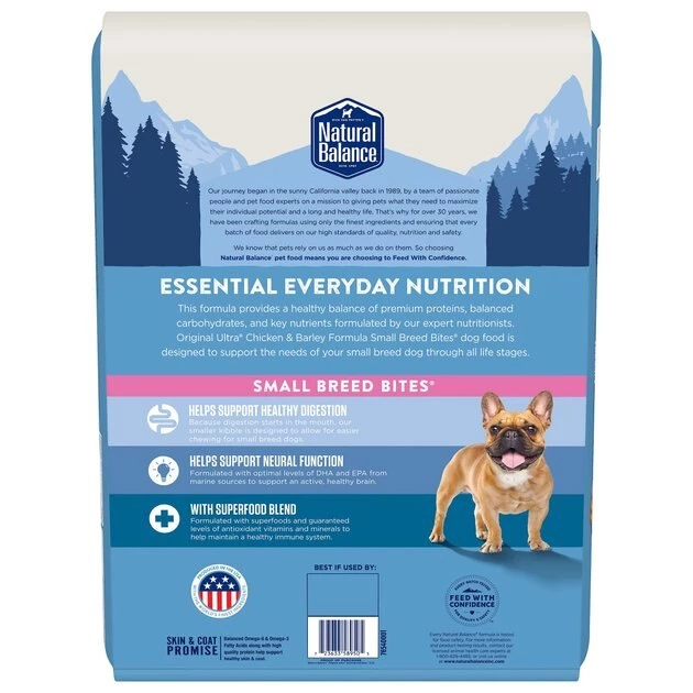 Nothing’s better than a tasty wholesome meal, and with Natural Balance Original Ultra Chicken & Barley Formula Small Breed Bites Dry Dog Food, you’ll know your best fur-iend is getting just that. Crafted with real, tasty chicken and rich barley, this meal is formulated with a nutritious superfood blend to provide your small pup with the vitamins and minerals he needs to lead an active, healthy lifestyle. Plus, essential amino acids and fiber support strong muscles and healthy digestion. This dry food is crafted into smaller bites––paw-fect for small breeds.
