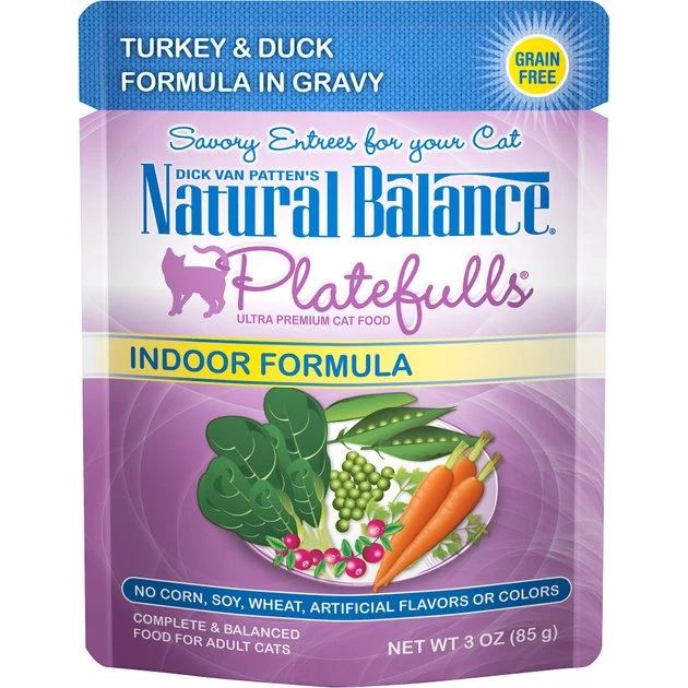 Treat your kitty to a plateful of goodness in every bowl with the Natural Balance Platefulls Indoor Formula Turkey & Duck Formula in Gravy Grain-Free Cat Food Pouches. Made especially for kitties with gourmet tastes, it features turkey and duck as the top ingredients for all the protein your pal needs to thrive—not to mention the irresistible flavor that’ll have him running to his bowl every time. It’s made with wholesome veggies for a boost of antioxidants in every juicy bite, and real broth so it supports urinary health and keeps your kitty hydrated. Since it’s fortified with vitamins, minerals and essential taurine, it makes a complete and balanced diet for adult cats. Plus, it has zero grains or anything artificial. Because foodie or not, he’s a carnivore at heart.
