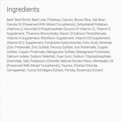 Beef, Beef Broth, Beef Liver, Potatoes, Carrots, Brown Rice, Oat Bran, Canola Oil (Preserved with Mixed Tocopherols), Dehydrated Potatoes, Vitamins (L-Ascorbyl-2-Polyphosphate (Source of Vitamin C), Vitamin E Supplement, Thiamine Mononitrate, Niacin, D-Calcium Pantothenate, Vitamin A Supplement, Riboflavin Supplement, Vitamin D3 Supplement, Vitamin B12 Supplement, Pyridoxine Hydrochloride, Folic Acid), Minerals (Zinc Proteinate, Zinc Sulfate, Ferrous Sulfate, Iron Proteinate, Copper Sulfate, Copper Proteinate, Manganese Sulfate, Manganese Proteinate, Calcium Iodate, Sodium Selenite), Guar Gum, Sodium Tripolyphosphate, Dried Kelp, Salt, Potassium Chloride, Natural Smoke Flavor, Menhaden Oil (Preserved with Mixed Tocopherols), Taurine, Choline Chloride, Carrageenan, Yucca Schidigera Extract, Parsley, Rosemary Extract.