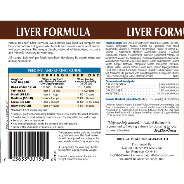 Recognized as one of the top canned foods by dog nutritionists! Go ahead, let your pup beg for seconds when you’re serving Natural Balance Ultra Premium Liver Formula Dog Food. This premium dog food is made from high-quality meats, healthy vegetables, and brown rice, and contains all of the nutrients and flavor your dog’s body and taste buds’ crave. Serve it as a meal on its own or as an extra-special treat to top off the dry food during all of those doggie birthdays.