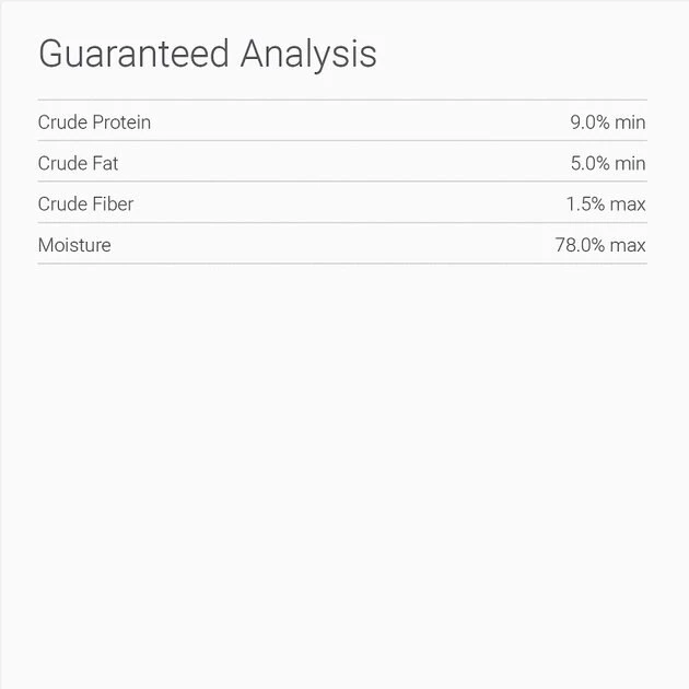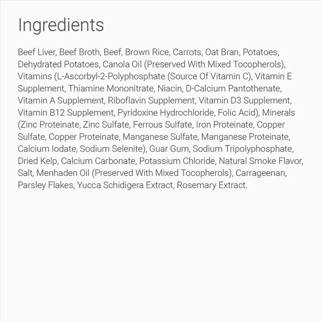 Beef Liver, Beef Broth, Beef, Brown Rice, Carrots, Oat Bran, Potatoes, Dehydrated Potatoes, Canola Oil (Preserved with Mixed Tocopherols), Vitamins (L-Ascorbyl-2-Polyphosphate (Source of Vitamin C), Vitamin E Supplement, Thiamine Mononitrate, Niacin, D-Calcium Pantothenate, Vitamin A Supplement, Riboflavin Supplement, Vitamin D3 Supplement, Vitamin B12 Supplement, Pyridoxine Hydrochloride, Folic Acid), Minerals (Zinc Proteinate, Zinc Sulfate, Ferrous Sulfate, Iron Proteinate, Copper Sulfate, Copper Proteinate, Manganese Sulfate, Manganese Proteinate, Calcium Iodate, Sodium Selenite), Guar Gum, Sodium Tripolyphosphate, Dried Kelp, Calcium Carbonate, Potassium Chloride, Natural Smoke Flavor, Salt, Menhaden Oil (Preserved with Mixed Tocopherols), Carrageenan, Parsley Flakes, Yucca Schidigera Extract, Rosemary Extract.