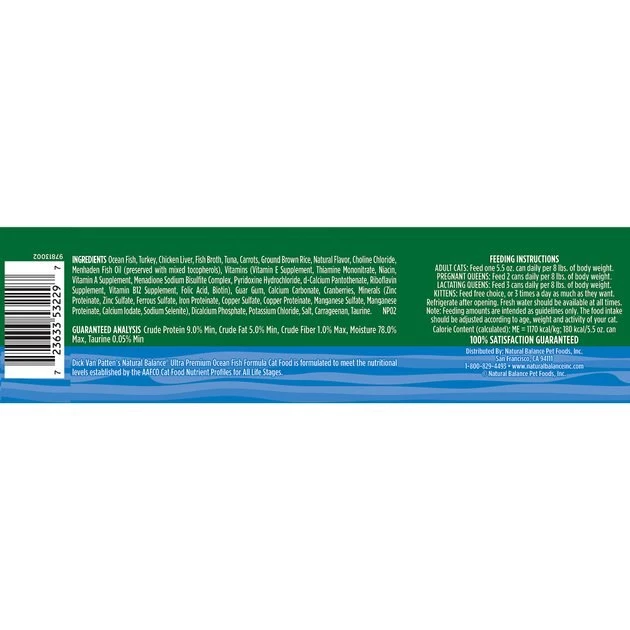 Ocean Fish, Turkey, Chicken Liver, Fish Broth, Tuna, Carrots, Ground Brown Rice, Natural Flavor, Choline Chloride, Menhaden Fish Oil (Preserved with Mixed Tocopherols), Vitamins (Vitamin E Supplement, Thiamine Mononitrate, Niacin, Vitamin A Supplement, Menadione Sodium Bisulfite Complex, Pyridoxine Hydrochloride, D-Calcium Pantothenate, Riboflavin Supplement, Vitamin B12 Supplement, Folic Acid, Biotin), Guar Gum, Calcium Carbonate, Cranberries, Minerals (Zinc Proteinate, Zinc Sulfate, Ferrous Sulfate, Iron Proteinate, Copper Sulfate, Copper Proteinate, Manganese Sulfate, Manganese Proteinate, Calcium Iodate,Sodium Selenite), Dicalcium Phosphate, Potassium Chloride, Salt, Carrageenan, Taurine .
