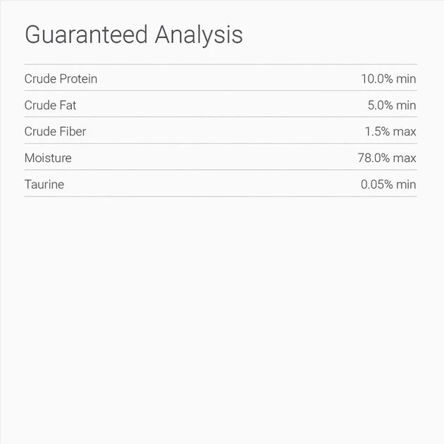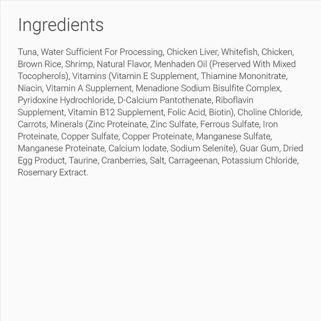 Tuna, Water Sufficient For Processing, Chicken Liver, Whitefish, Chicken, Brown Rice, Shrimp, Natural Flavor, Menhaden Oil (Preserved with Mixed Tocopherols), Vitamins (Vitamin E Supplement, Thiamine Mononitrate, Niacin, Vitamin A Supplement, Menadione Sodium Bisulfite Complex, Pyridoxine Hydrochloride, D-Calcium Pantothenate, Riboflavin Supplement, Vitamin B12 Supplement, Folic Acid, Biotin), Choline Chloride, Carrots, Minerals (Zinc Proteinate, Zinc Sulfate, Ferrous Sulfate, Iron Proteinate, Copper Sulfate, Copper Proteinate, Manganese Sulfate, Manganese Proteinate, Calcium Iodate, Sodium Selenite), Guar Gum, Dried Egg Product, Taurine, Cranberries, Salt, Carrageenan, Potassium Chloride, Rosemary Extract.